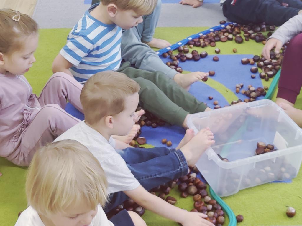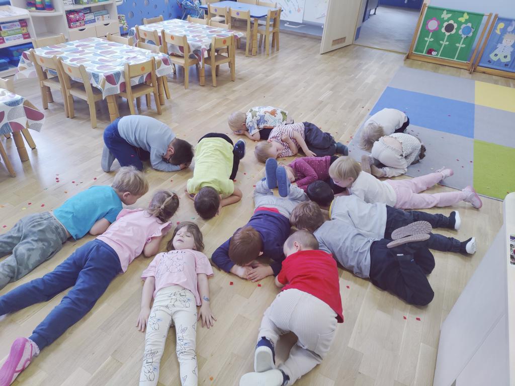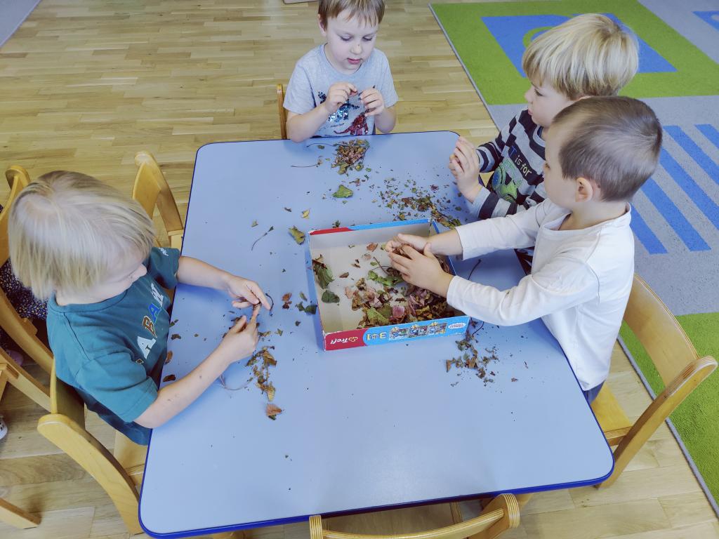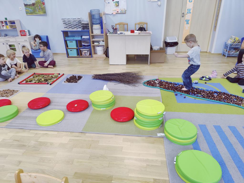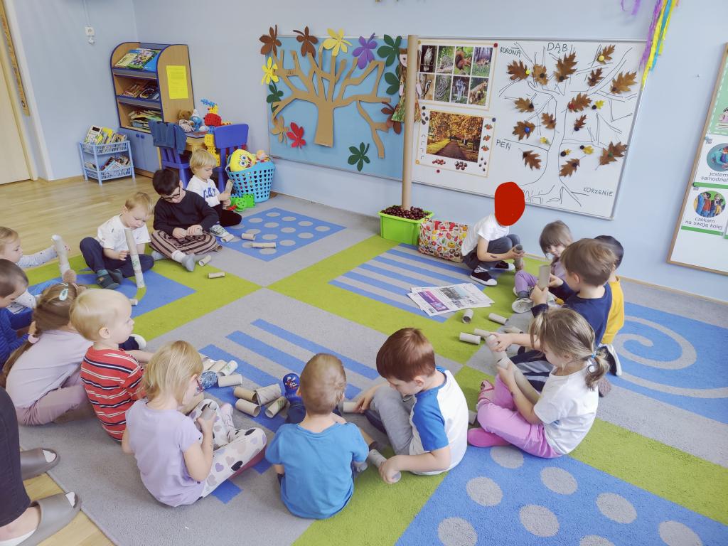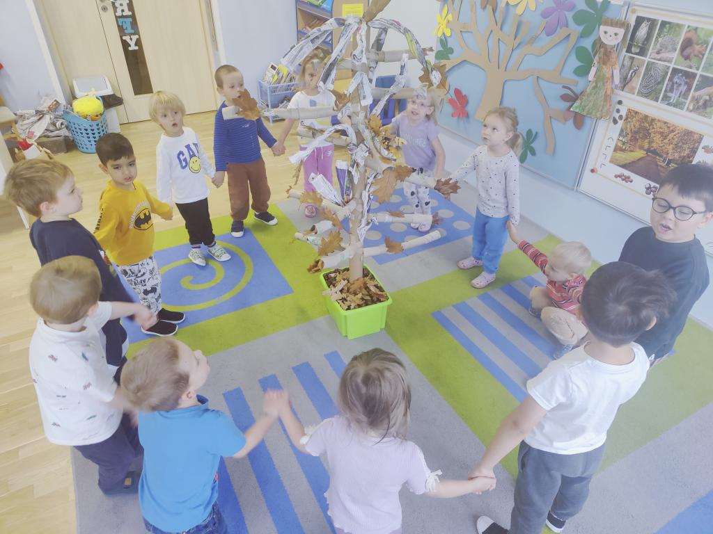 10 października obchodziliśmy „Dzień Drzewa”. W tym dniu omawialiśmy budowę drzew, rozmawialiśmy o ich znaczeniu dla człowieka, uczyliśmy się rozróżniać różne gatunki drzew. Wykonaliśmy pierwszą kartkę z liściem dębu do naszgo przyrodniczego albumu. Obchody takiego święta są dobrą okazją do kształcenia świadomości ekologicznej i zwrócenia uwagi na piękno otaczającej nas przyrody, dlatego wykonaliśmy drzewa z materiałów naturalnych i odpadowych, stworzyliśmy ścieżkę sensoryczną z użyciem jesiennych darów, a na koniec udaliśmy się na spacer, aby obserwować jak drzewa przybierają barwy jesieni.