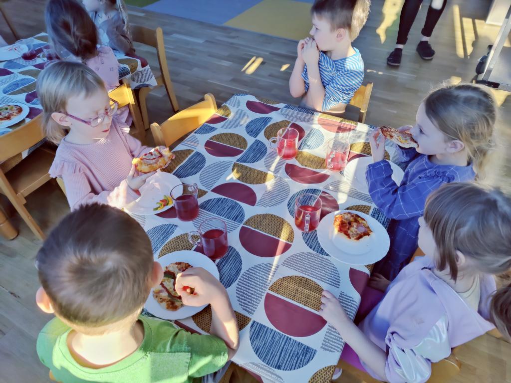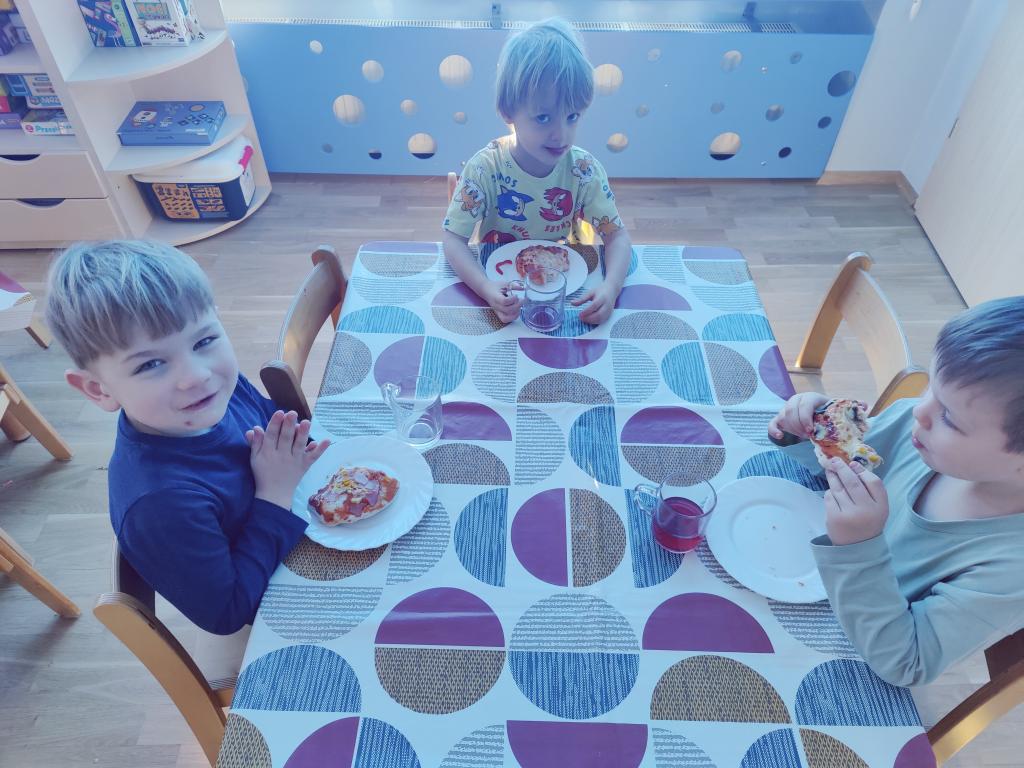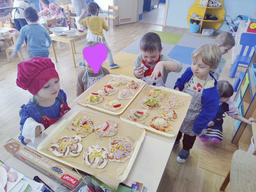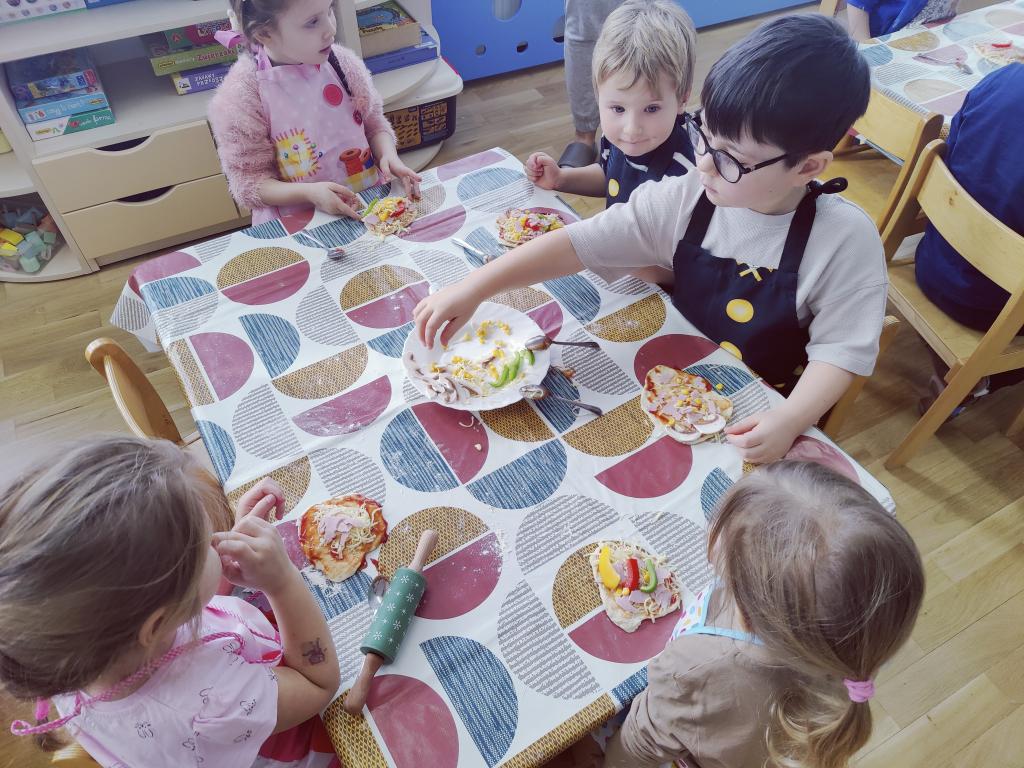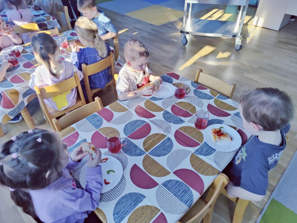 Początek minionego tygodnia rozpoczęliśmy kulinarnie, ponieważ 9 lutego obchodzony jest Dzień Pizzy. Po porządnym umyciu rąk i ubraniu fartuszków, przygotowaliśmy swoje pizze z ulubionych składników. Po ułożeniu kolorowych placków na papierze do pieczenia niecierpliwie czekaliśmy aż nasze smakołyki powrócą do nas upieczone i pachnące. Pizze zjedliśmy na podwieczorek. Każdemu smakowały.