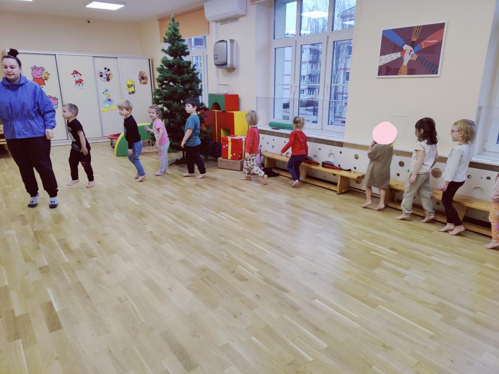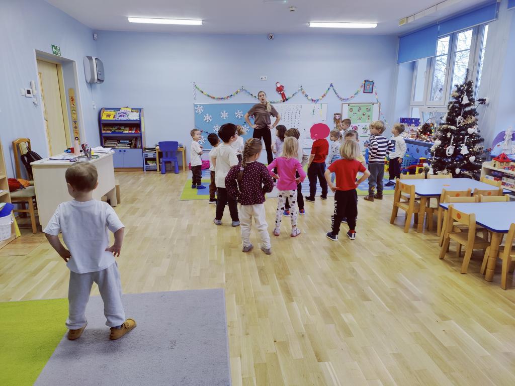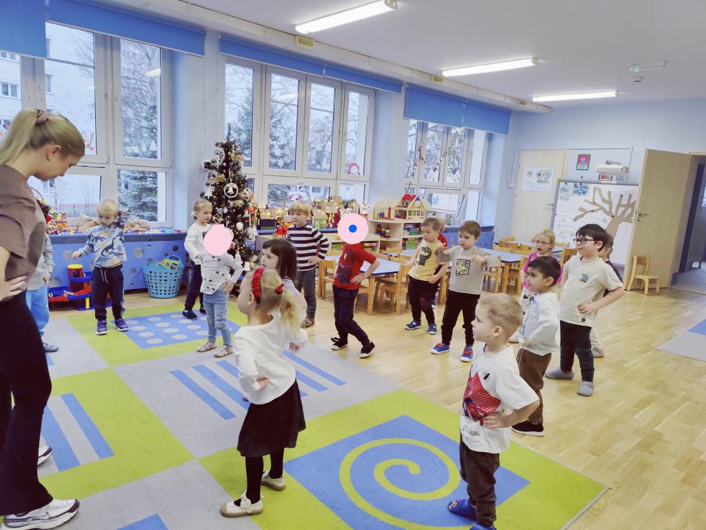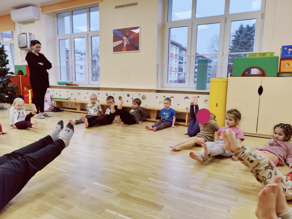 Na zajęciach sportowych chętnie trenowaliśmy z Panią instruktorką, wykonując ćwiczenia jak najdokładniej.