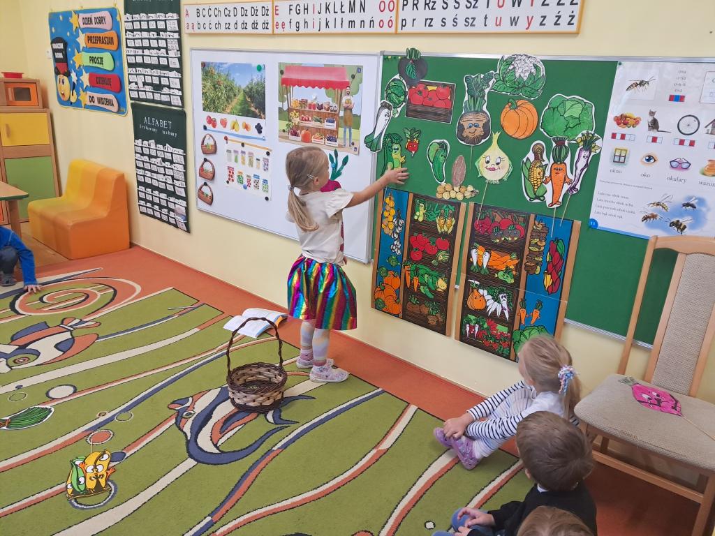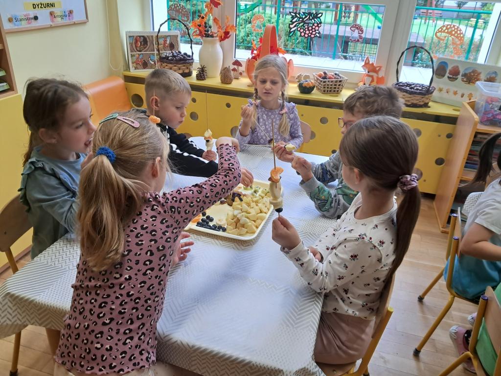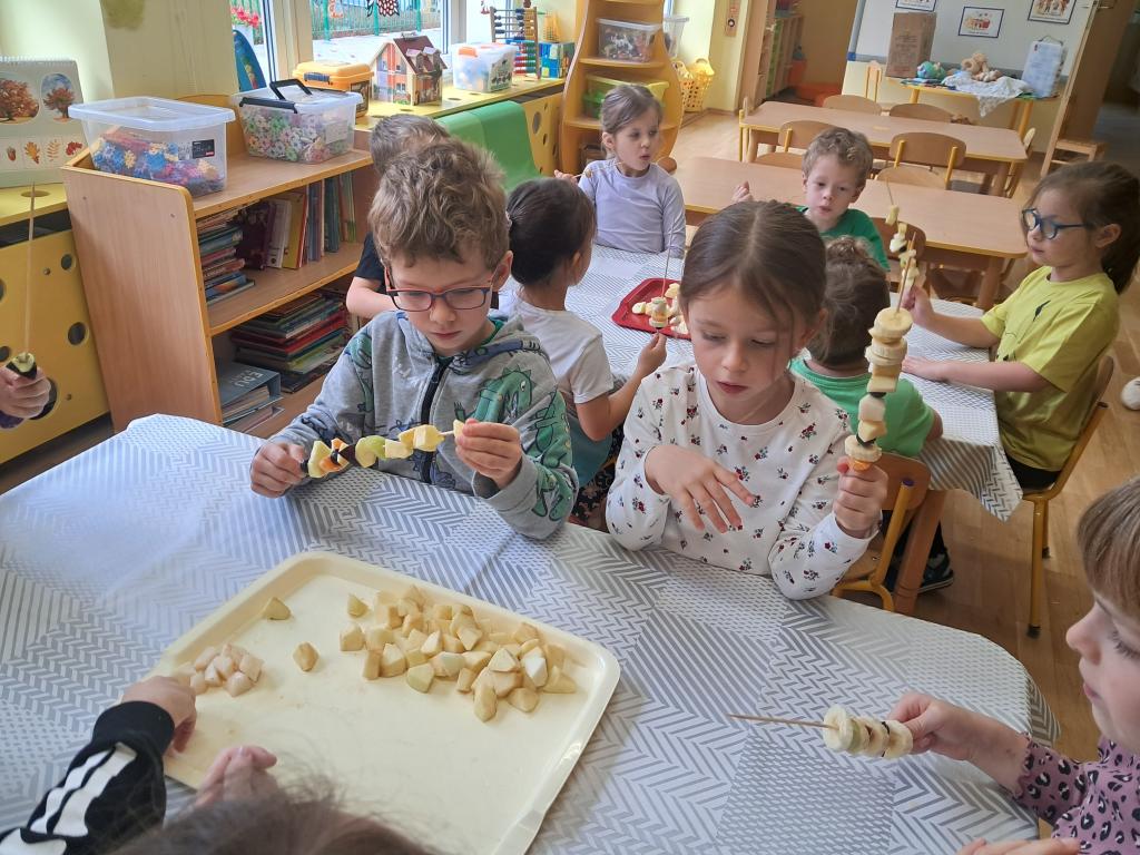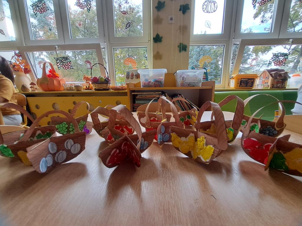 Słonka poznawały dary z sadu i z ogrodu. Rozróżniały, nazywały i klasyfikowały owoce i warzywa. Doskonaliły umiejętności rozpoznawania i nazywania drzew owocowych. Utrwalały nazwy owoców i warzyw. Dowiadywały się, która część warzyw jest jadalna. Poznawały jak ważne jest spożywanie owoców i warzyw. Podczas  zabaw dzieci utrwalały pojęcia matematyczne, ćwiczyły przeliczanie, utrwalały kształty i kolory. Poznawaliśmy i śpiewaliśmy piosenki o tematyce jesiennej. Dzieci wykonywały prace plastyczne, rysowały, kolorowały oraz malowały farbami. Odbyła się również degustacja owoców.