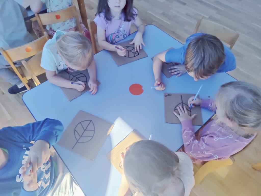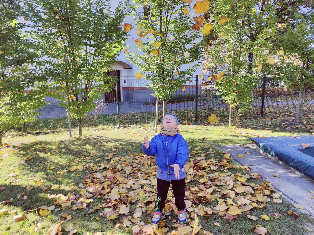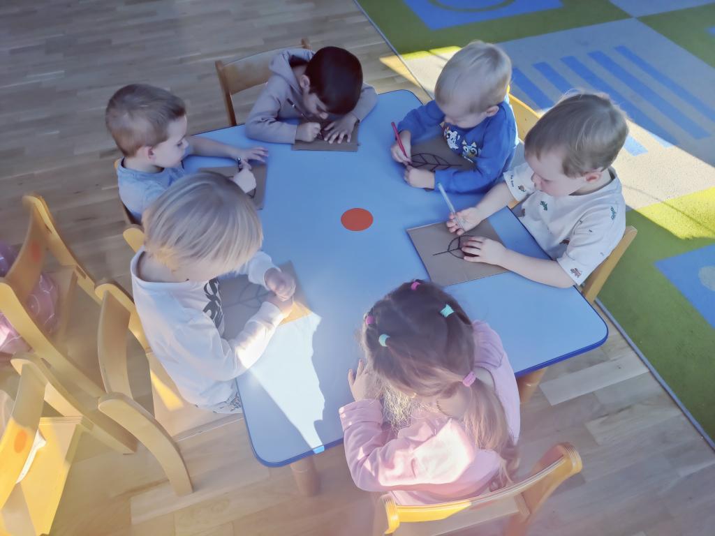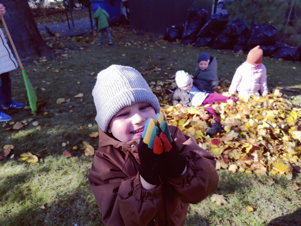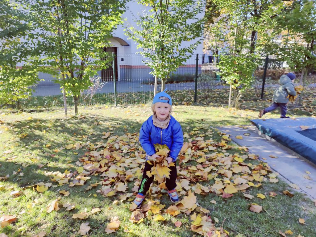 Jesień ukazała w pełni swą urodę, zasypując nasz plac zabaw pięknymi liśćmi, co bardzo nam się podobało. Mogliśmy bowiem w pełni się nimi nacieszyć między innymi przez zabawy polegające na zakopywananiu się w liściach, grabieniu i ich ponownym rozrzucaniu. Ostatni dzień tygodnia powitał nas w deszczowo ale to nic, bo i na to mieliśmy radę ucząc się piosenki pt. „W deszczowym rytmie”. Humor poprawiły nam również dzieci z grupy „Żabki”, ponieważ wraz ze swoją Panią przyniosły nam poczęstunek, w postaci ciasta marchewkowego, któro co do okruszka zostało przez nas zjedzone, trzeba przyznać, że naprawdę im się udało. Także nasza koleżanka świętowała swoje czwarte urodziny i znowu było coś pysznego do zjedzenia, ale najpeierw trzeba było złożyć życzenia, a później wykonać pamiątkowy album.