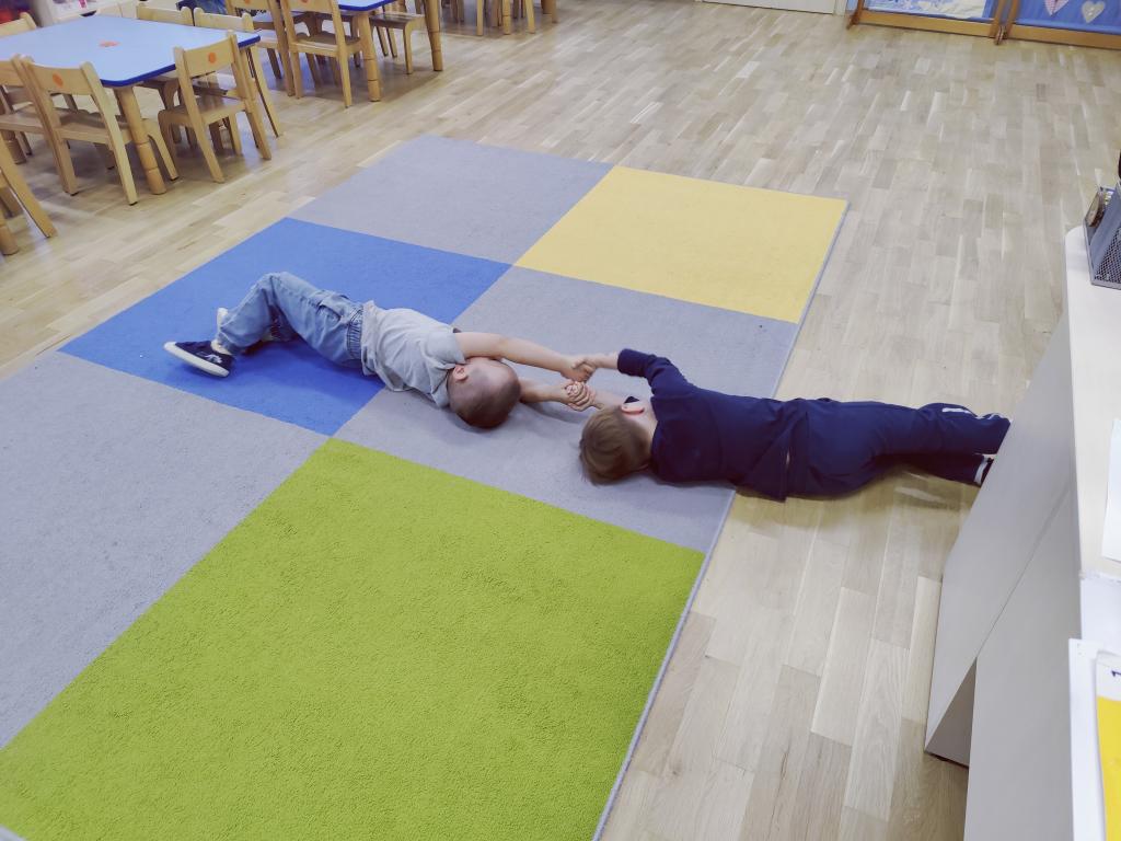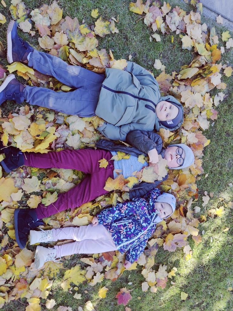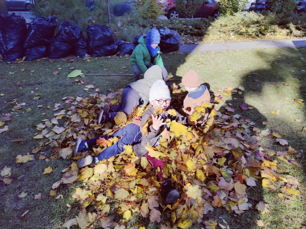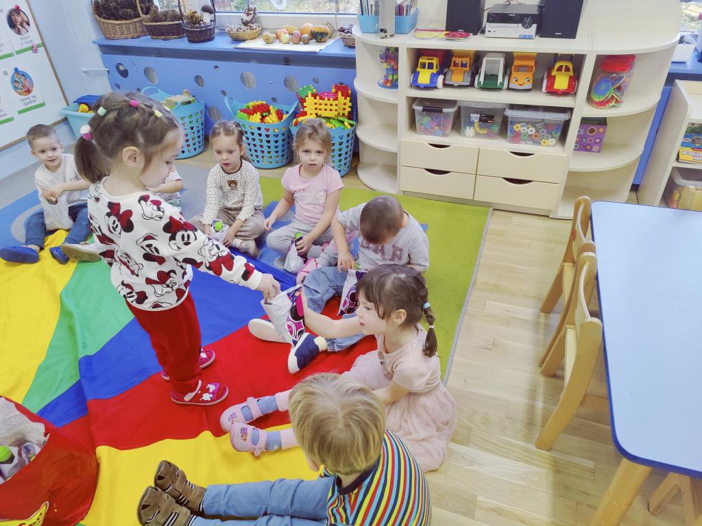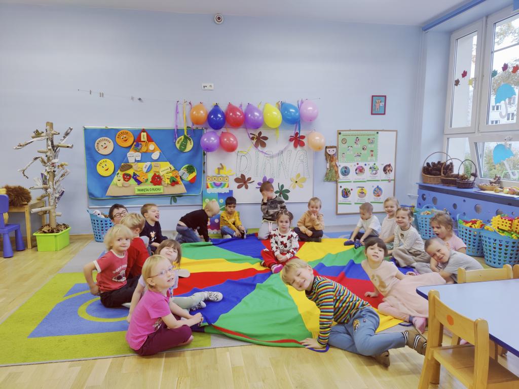 Jesień ukazała w pełni swą urodę, zasypując nasz plac zabaw pięknymi liśćmi, co bardzo nam się podobało. Mogliśmy bowiem w pełni się nimi nacieszyć między innymi przez zabawy polegające na zakopywananiu się w liściach, grabieniu i ich ponownym rozrzucaniu. Ostatni dzień tygodnia powitał nas w deszczowo ale to nic, bo i na to mieliśmy radę ucząc się piosenki pt. „W deszczowym rytmie”. Humor poprawiły nam również dzieci z grupy „Żabki”, ponieważ wraz ze swoją Panią przyniosły nam poczęstunek, w postaci ciasta marchewkowego, któro co do okruszka zostało przez nas zjedzone, trzeba przyznać, że naprawdę im się udało. Także nasza koleżanka świętowała swoje czwarte urodziny i znowu było coś pysznego do zjedzenia, ale najpeierw trzeba było złożyć życzenia, a później wykonać pamiątkowy album.