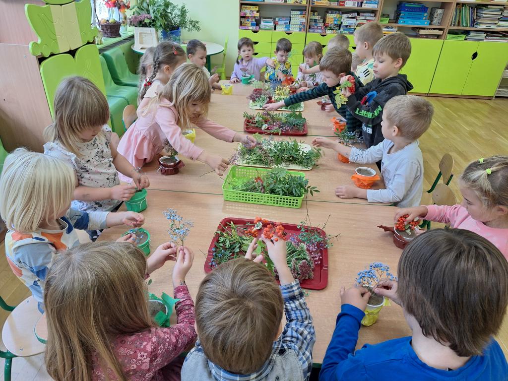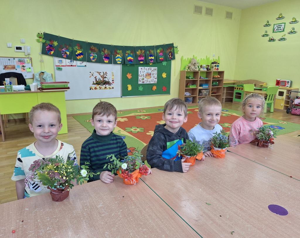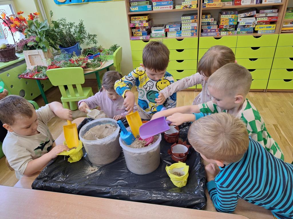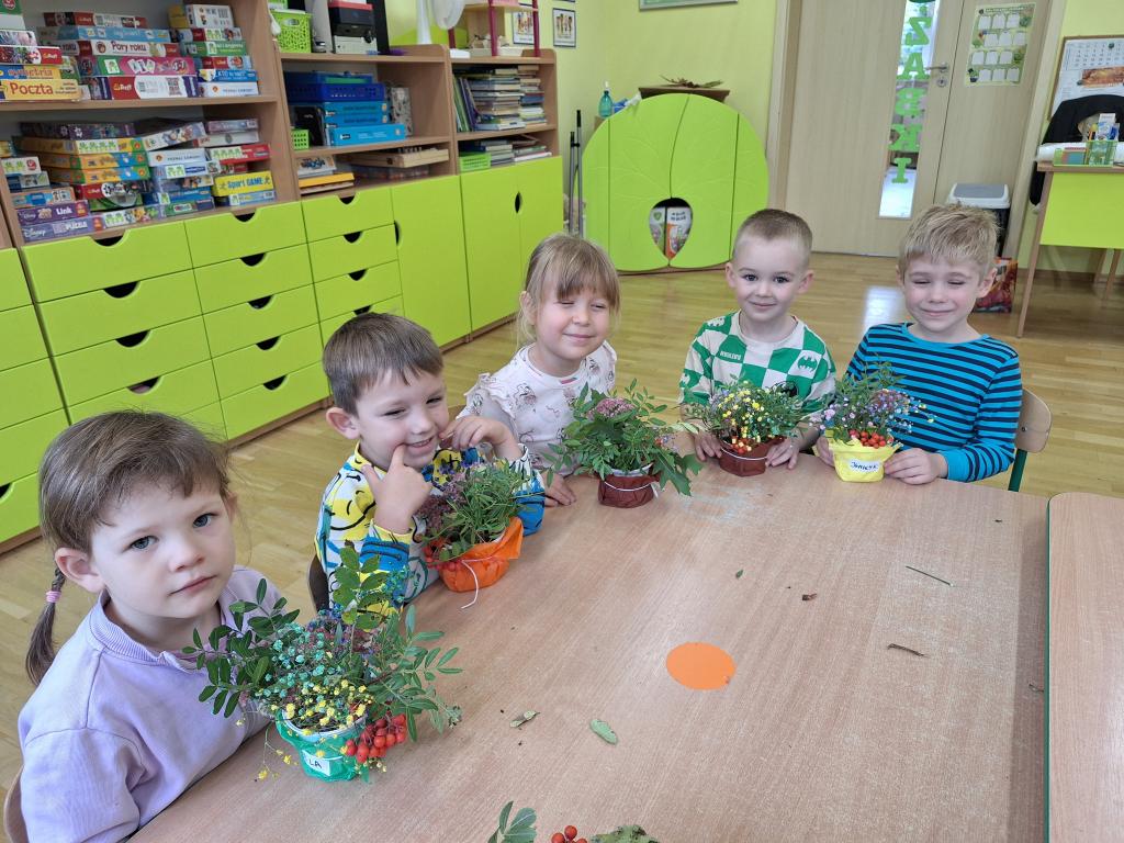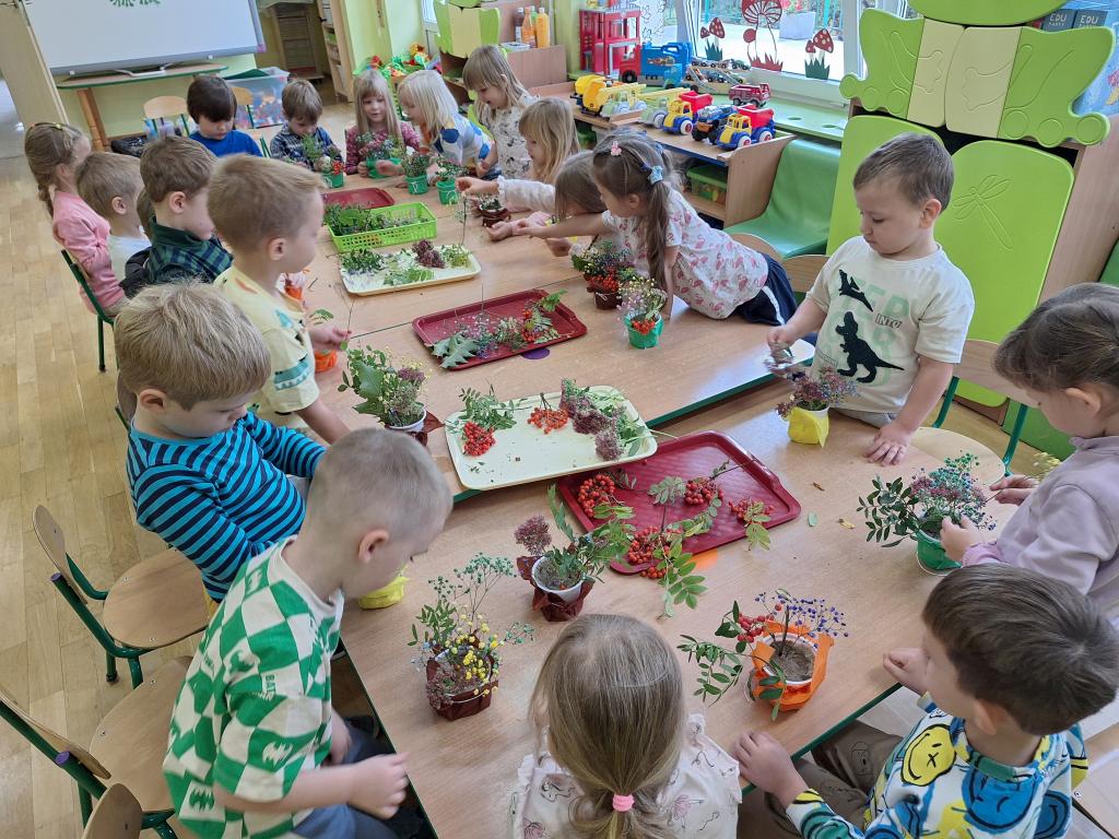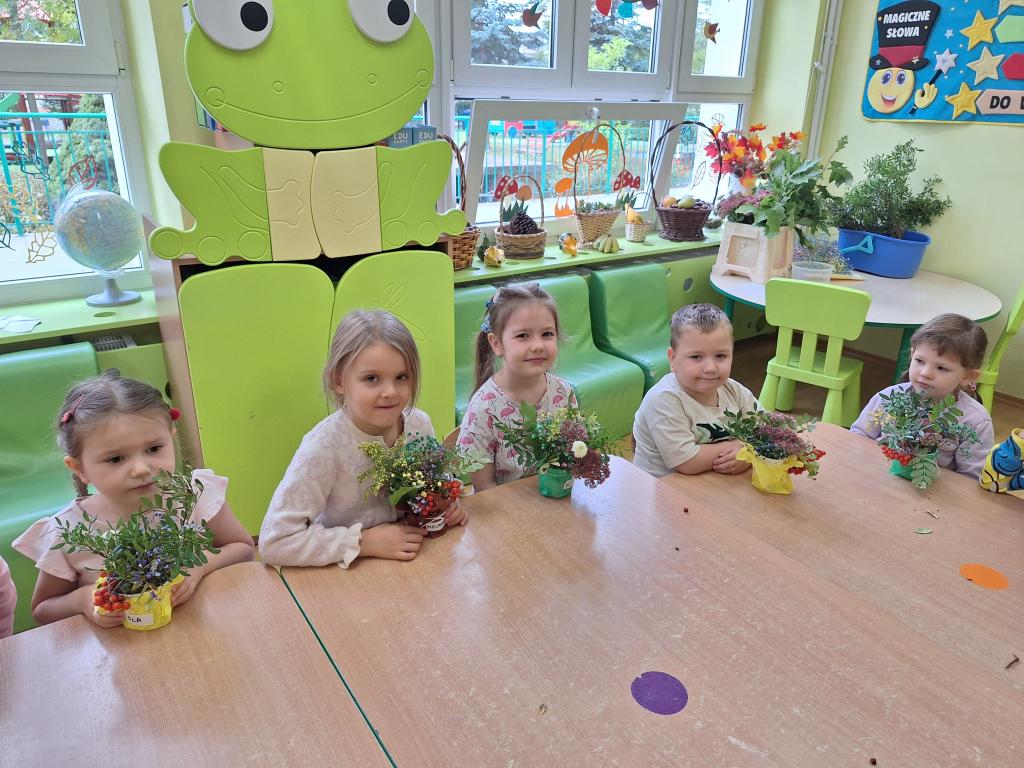Dzięki uprzejmości grupy Smerfów, której zostały rośliny po zajęciach tworzenia kompozycji jesiennych, Żabki stworzyły swoje piękne, jesienne bukiety. Dzieci najpierw poznały nazwy roślin z których mogły skorzystać, a następnie zabrały się do pracy. Pierwszym zadaniem było wsypanie piasku do pojemników, a następnie ułożenie jesiennych bukietów według uznania. Dzeciom bardzo podobało się tworzenie kompozycji, które później z dumą prezentowały innym. Jeszcze raz dziękujemy Smerfom za możliwość wspaniałej i kreatywnej zabawy.