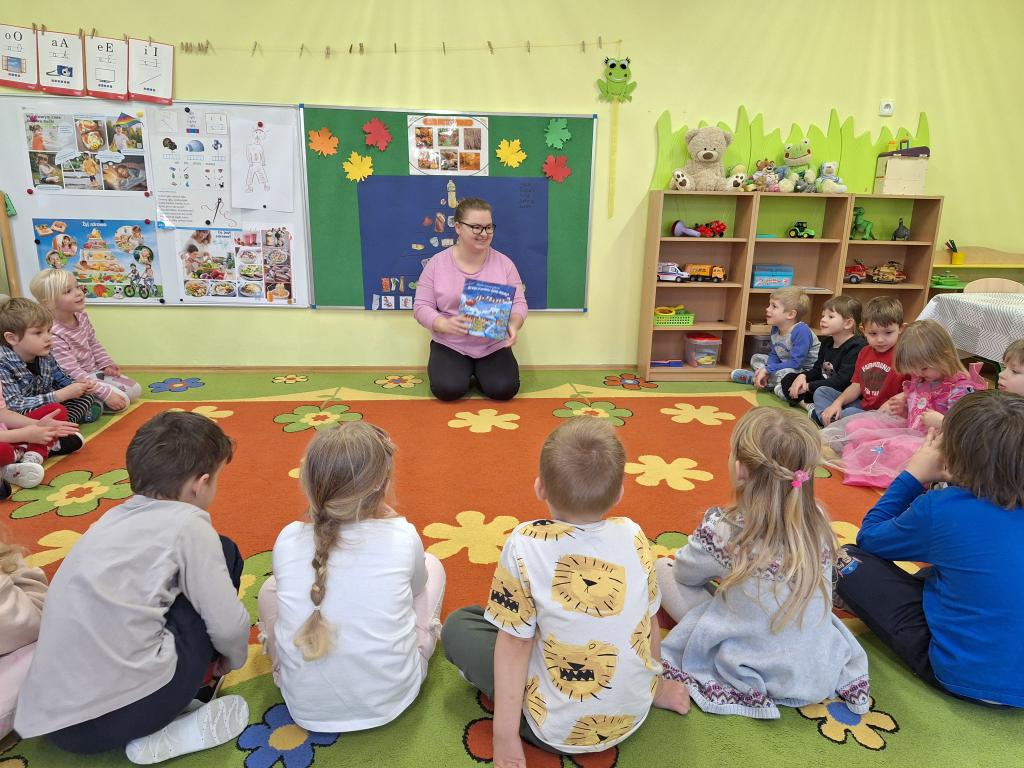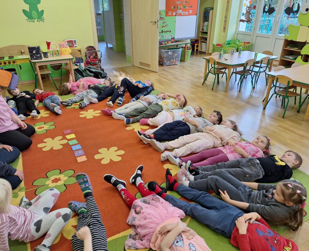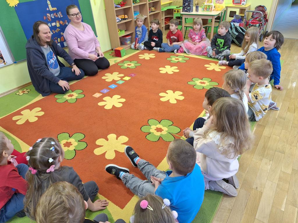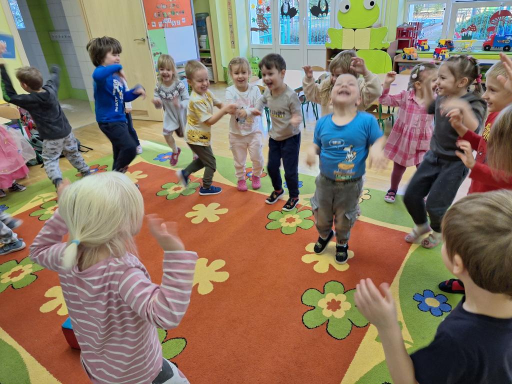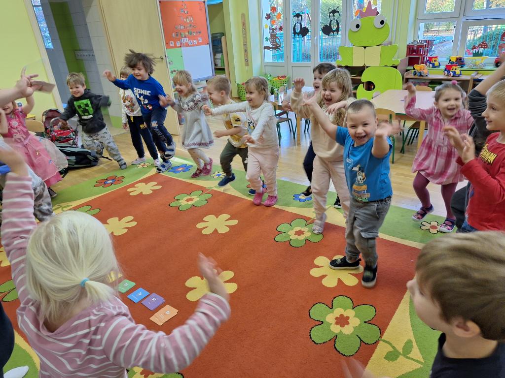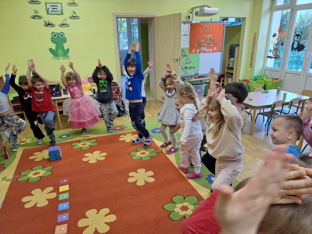 21 października naszą grupę odwiedzili Rodzie naszej koleżanki, która tego dnia miała urodziny. Na początku zajęć wysłuchaliśmy opowiadnia czytanego przez Mamę naszej koleżanki, a następnie chwilę rozmawialiśmy na jego temat. Żabki z zainteresowaniem słuchały i rozmawiały o jej bohaterach. Później przyszedł czas na śpiewanie "Sto lat" i życzenia. Po części oficjalnej przyszedł czas na mały poczęstunek przygotowany z tej okazji. Na zakończenie odbyły się wesołe zabawy i zadania do wykonania. Każde dziecko rzucało kostką, a następnie wszyscy wykonywaliśmy zadanie, które wylosowało. Zabawa dostarczyła nam wiele radości i śmiechu. Dziękujemy bardzo Rodzicom za tak wspaniały czas!