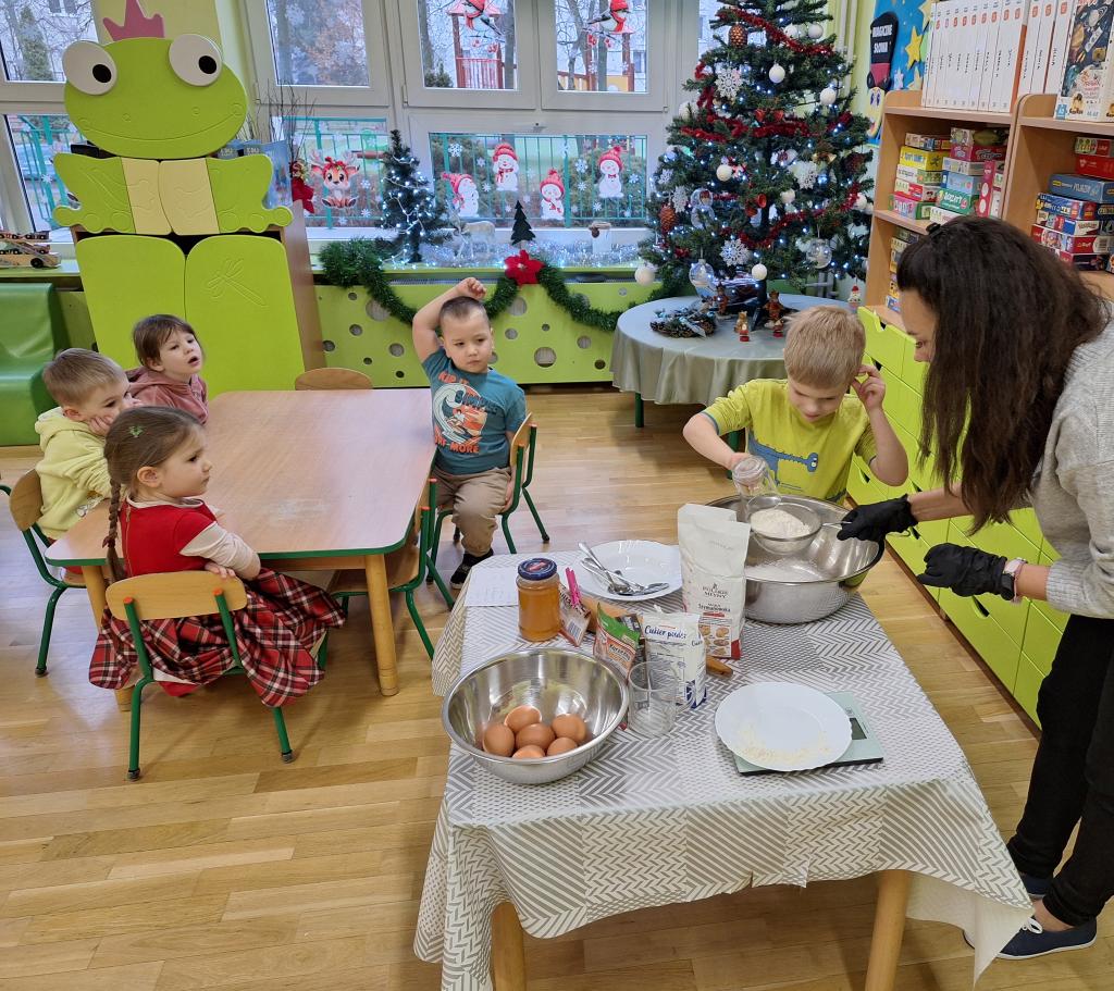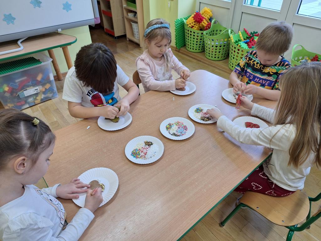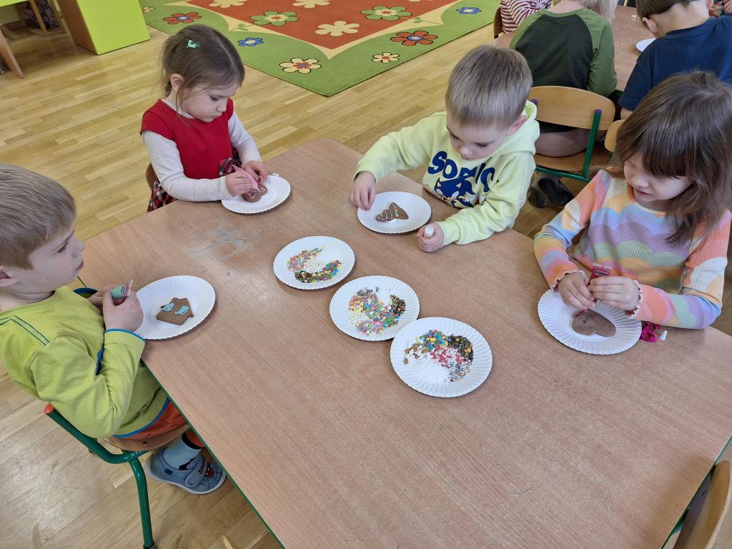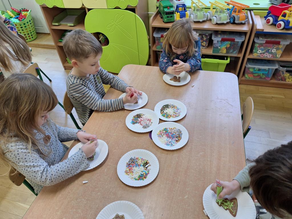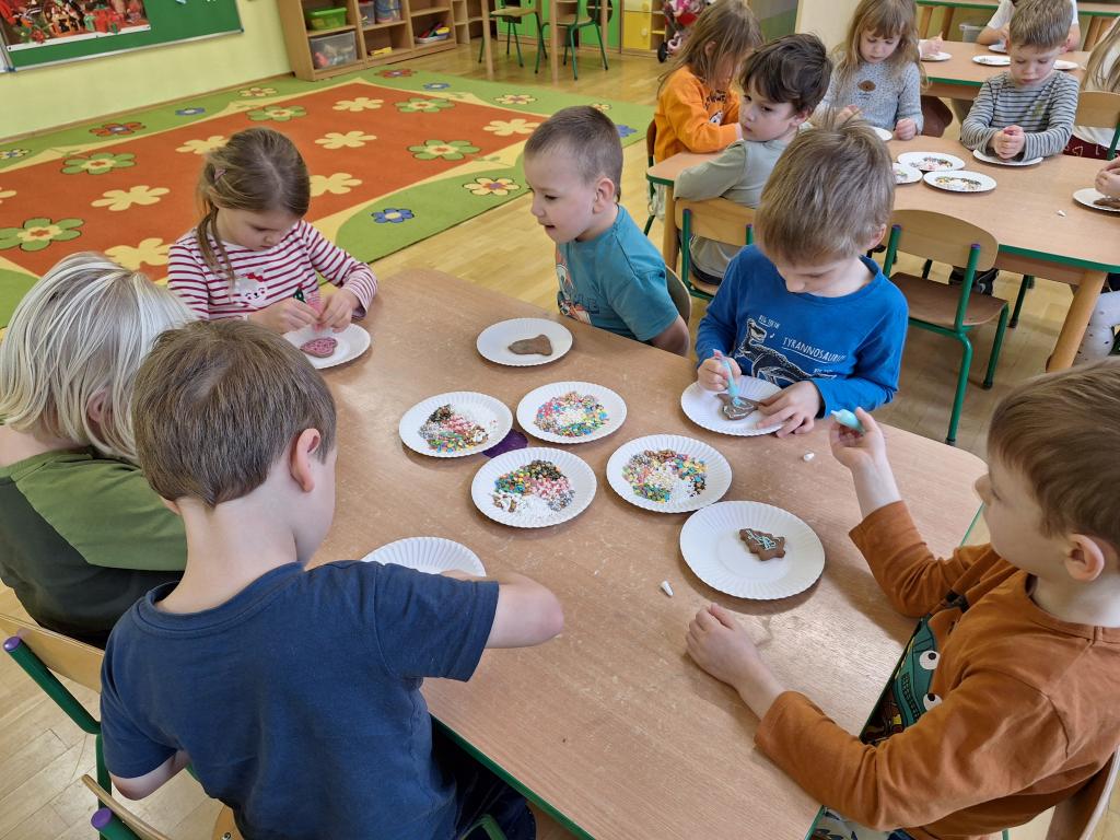 Dnia 18 grudnia w naszym przedszkolu odbyło się wspólne pieczenie pierniczków. Dzieci z radością uczestniczyły w przygotowaniach, poznając składniki potrzebne do wykonania ciasta oraz etapy jego wyrabiania. Następnie, przy pomocy nauczycieli, wałkowały ciasto i wykrawały pierniczki w różnych kształtach. Po upieczeniu pierniczki zostały udekorowane kolorowymi posypkami i lukrem. Zajęcia sprawiły dzieciom wiele radości, rozwijały ich sprawność manualną oraz uczyły współpracy w grupie. Bardzo dziękujemy Rodzicom, którzy zaangażowali się i przynieśli foremki do pierniczków, miód, lukrowe pisaki i kolorowe posypki Na koniec wspólnie spróbowaliśmy przygotowanych wypieków, a nawet mogliśmy poczęstować wszystkich którzy tego dnia dowiedzili nasze Przedszkole. Mamy nadzieję, że niespodzianka sprawiła wszystkim radość i chociaż trochę osłodziła grudniowy dzień :)