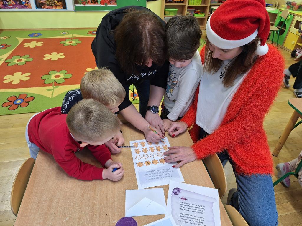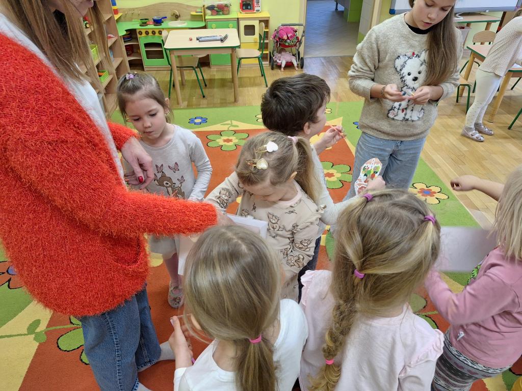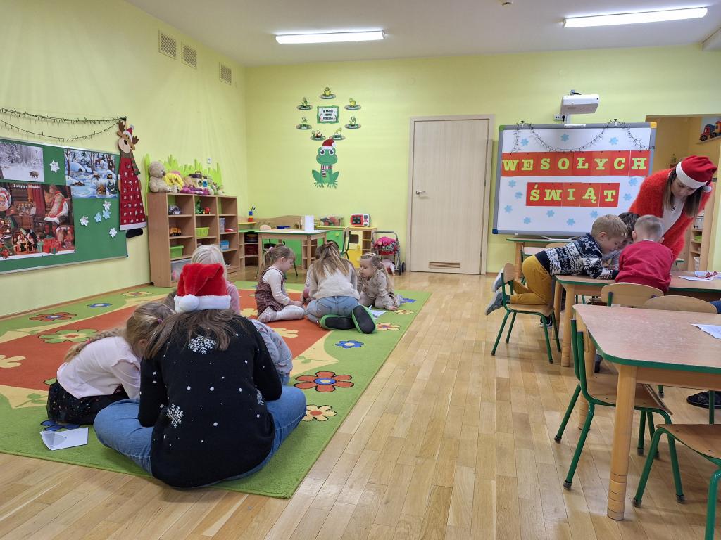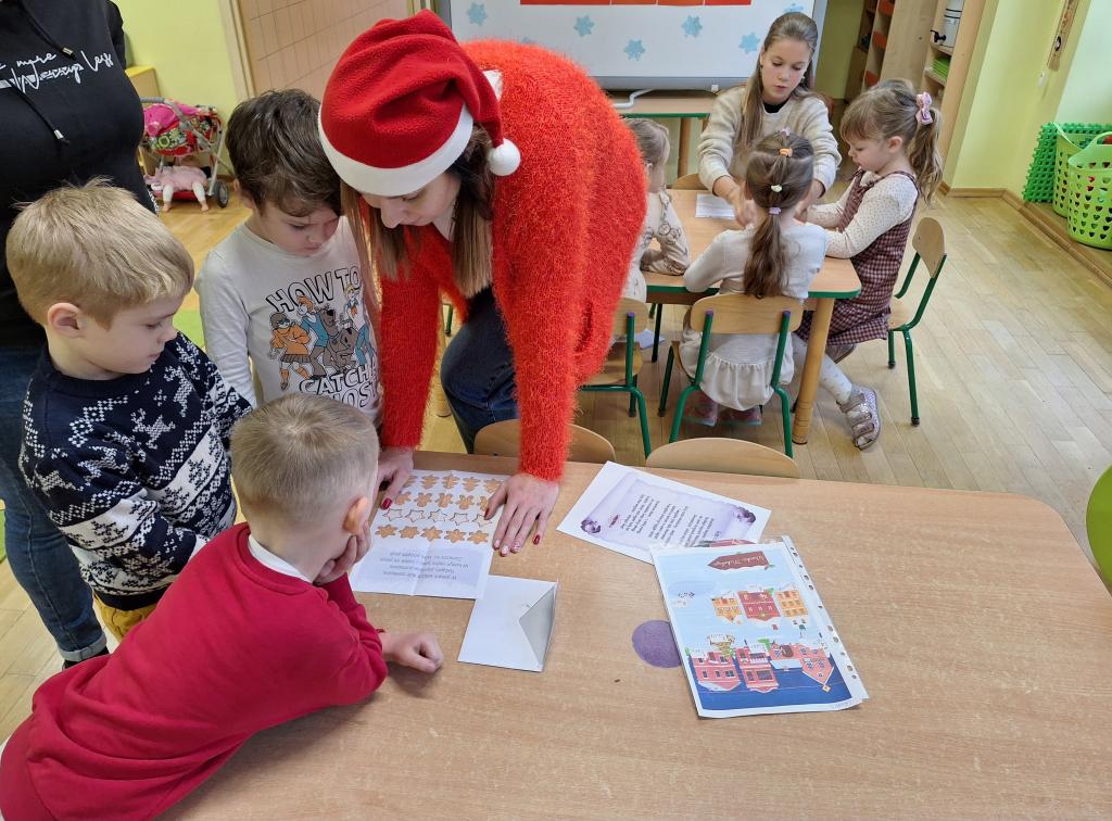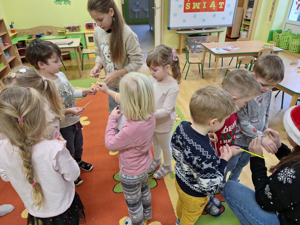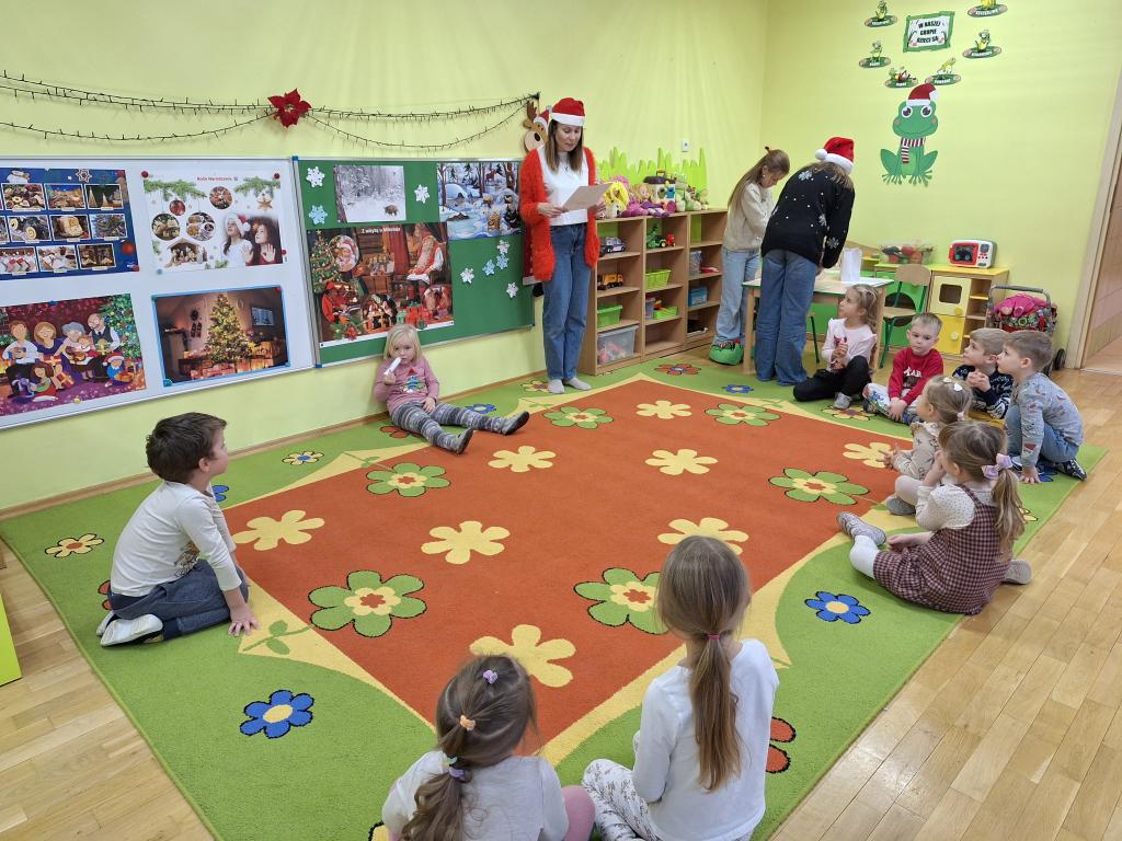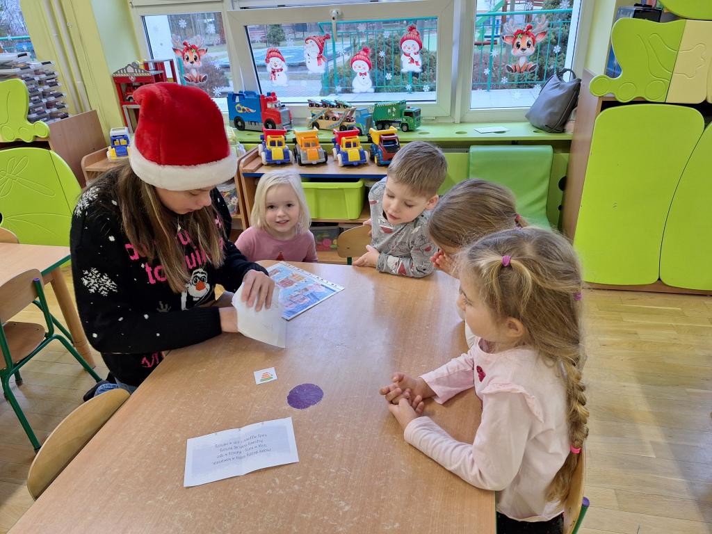 W poniedziałek 22 grudnia w naszym przedszkolu odbyła się zabawa pt. „Świąteczne podchody z elfami”. Dzięki uprzejmości Mamy z Rady Rodziców i byłych uczennic naszego Przedszkola dzieci miały okazję wziąć udział w różnorodnych zagadkach i zadaniach w małych grupach. Dzieci, podążając za wskazówkami pozostawionymi przez elfy, wykonywały kolejne ćwiczenia związane z tematyką świąteczną. Zadania wymagały współpracy oraz spostrzegawczości. Żabki z dużym zaangażowaniem rozwiązywały zagadki, pokonywały przygotowane konkurencje i z radością odkrywały kolejne etapy zabawy. Świąteczne podchody dostarczyły dzieciom wielu pozytywnych emocji oraz były doskonałą okazją do wspólnej zabawy i integracji grupy. Na zakończenie dzieci otrzymały drobne upominki. Bardzo dziękujemy za odwiedziny i wspólną zabawę!