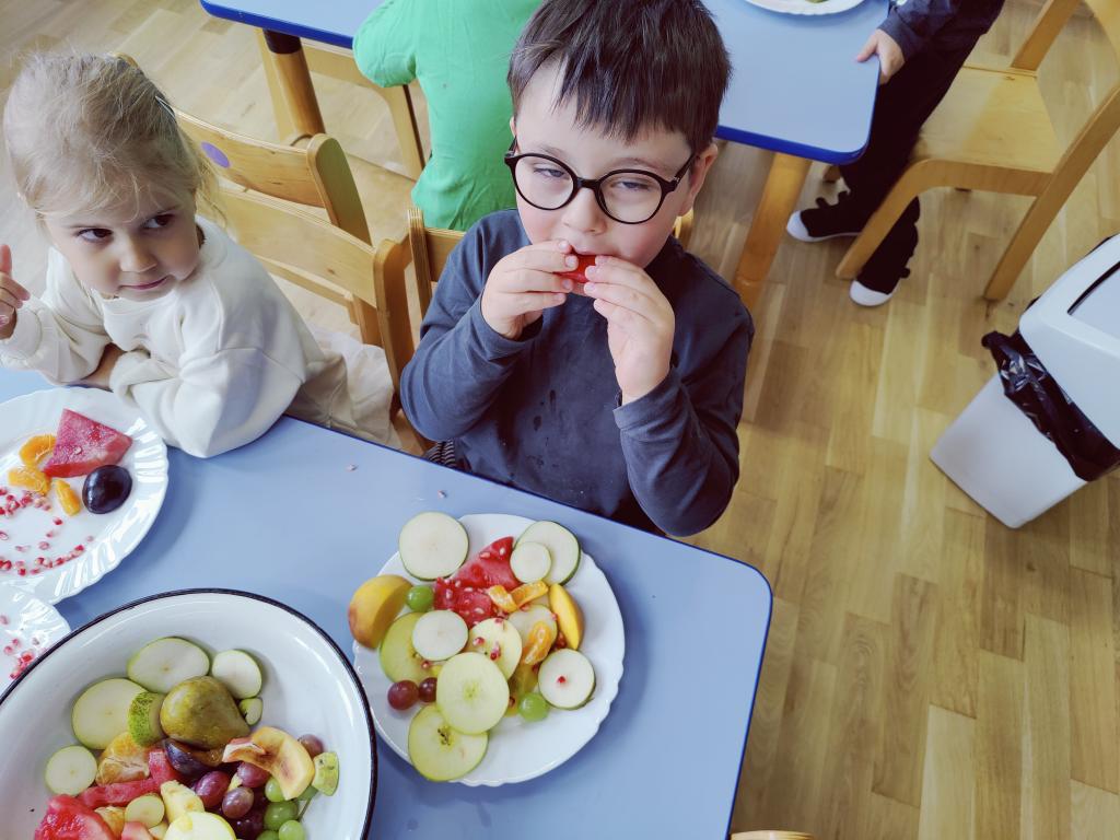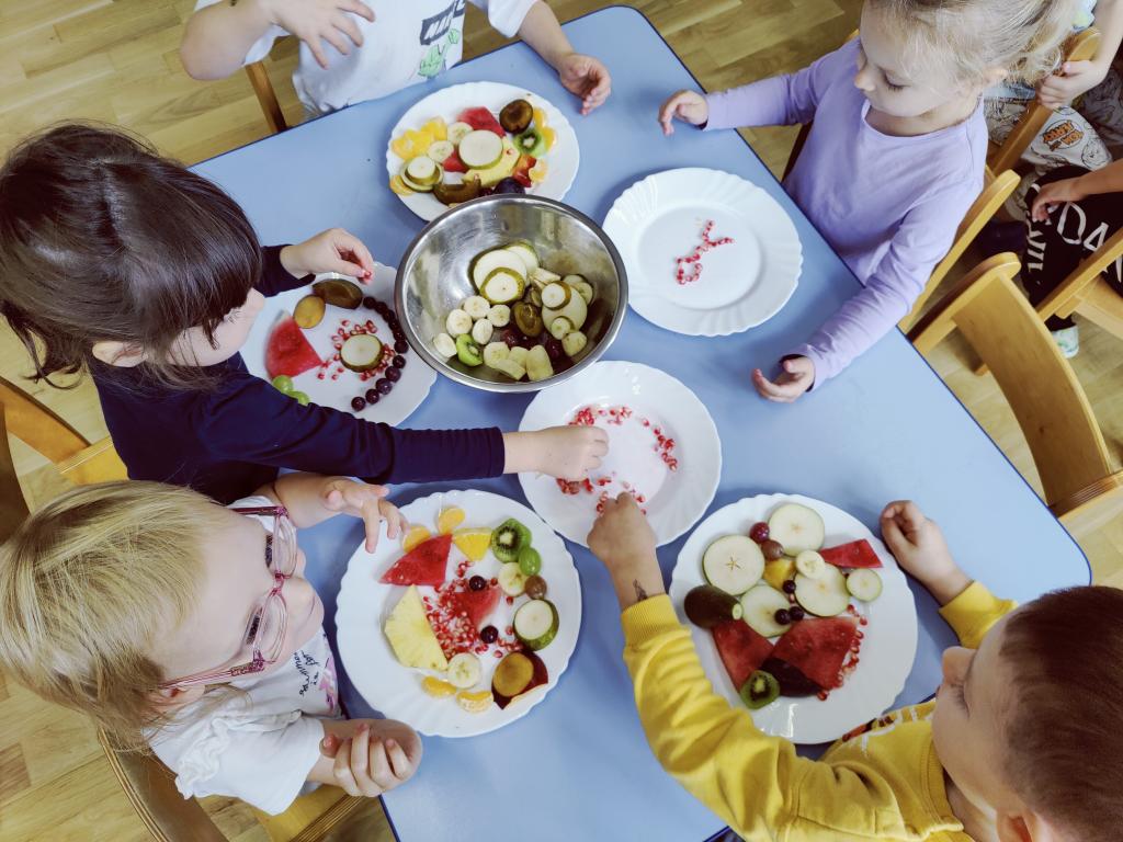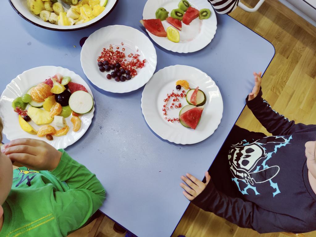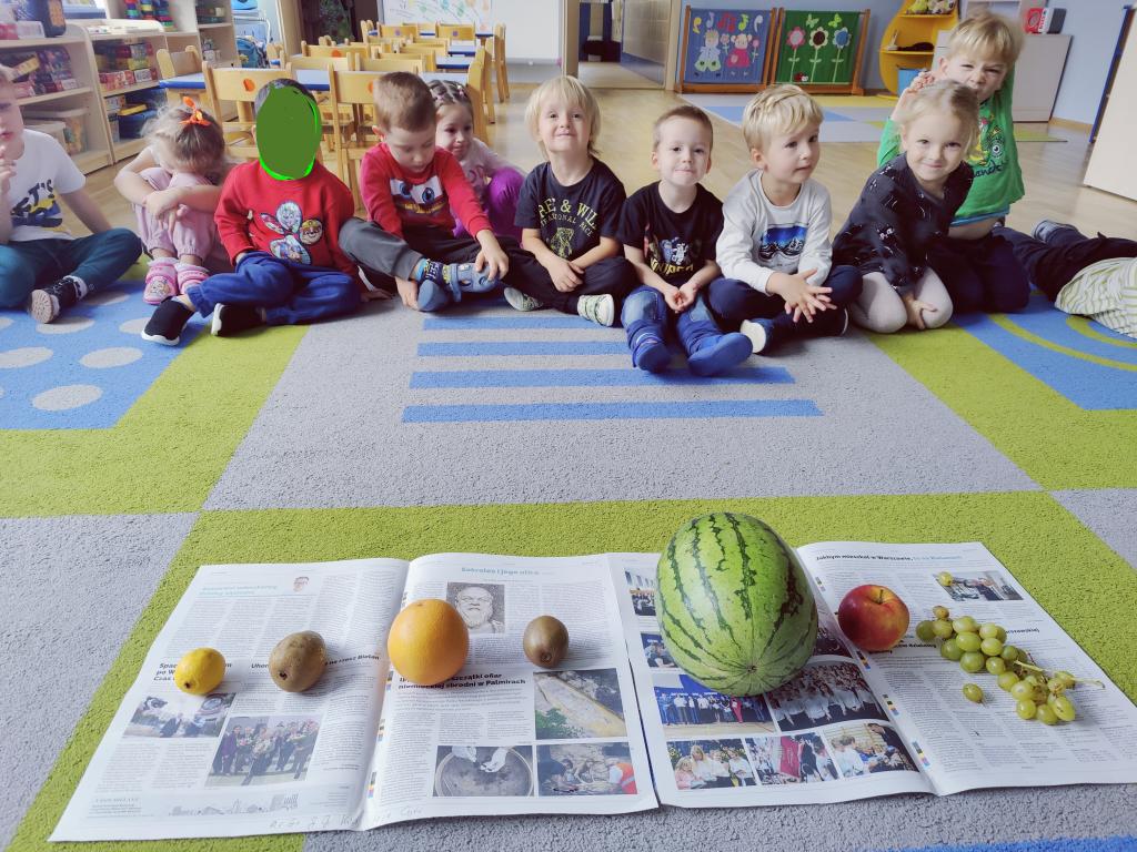 „Co daje nam jedzenie warzyw i owoców i czy w ogóle jest nam potrzebne?”- takie pytania zadawaliśmy sobie w minionym tygodniu, ponieważ tematem naszych zajęć były właśnie warzywa i owoce. Z przyniesionych do przedszkola owoców tworzyliśmy kolorowe obrazki, które chętnie zostały przez nas zjedzone, poznawaliśmy owoce nie tylko smakiem ale i dotykiem, a pod koniec tygodnia wybraliśmy się na zakupy do pobliskiego sklepiku, gdzie jedna grupa kupiła warzywa a druga owoce. Pyszne malinki zniknęły z talerza bardzo szybko, a świadomość, że jedzenie warzyw i owoców dostarcza nam witamin została.