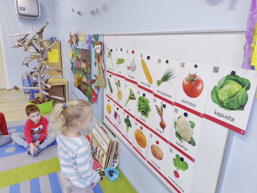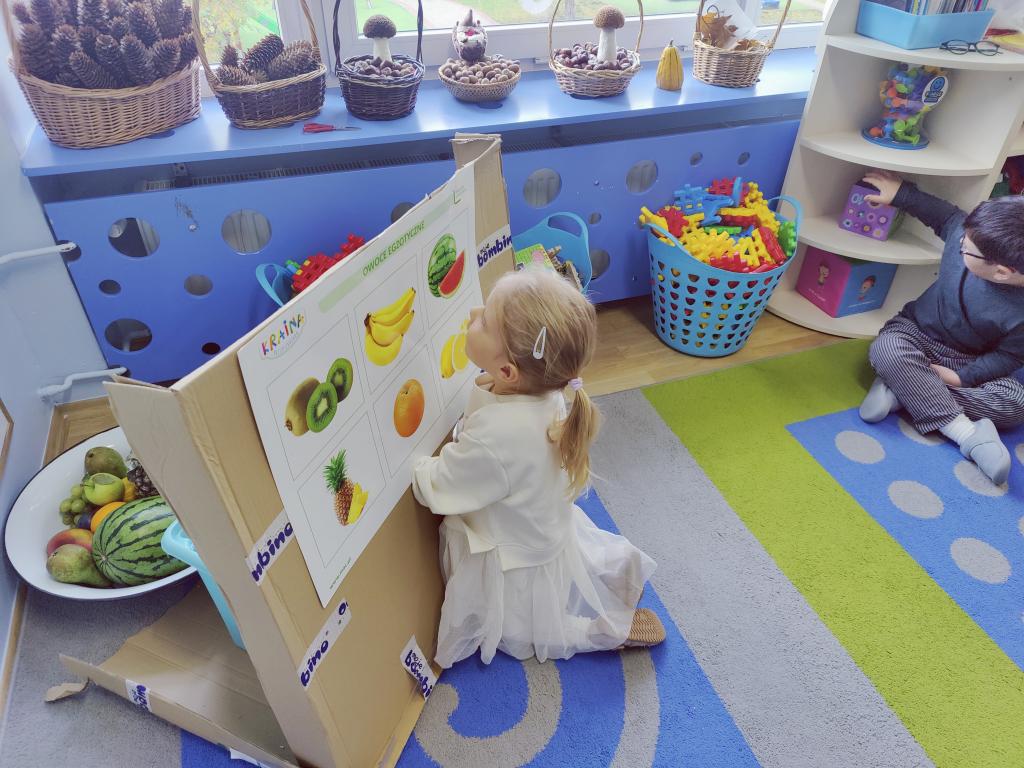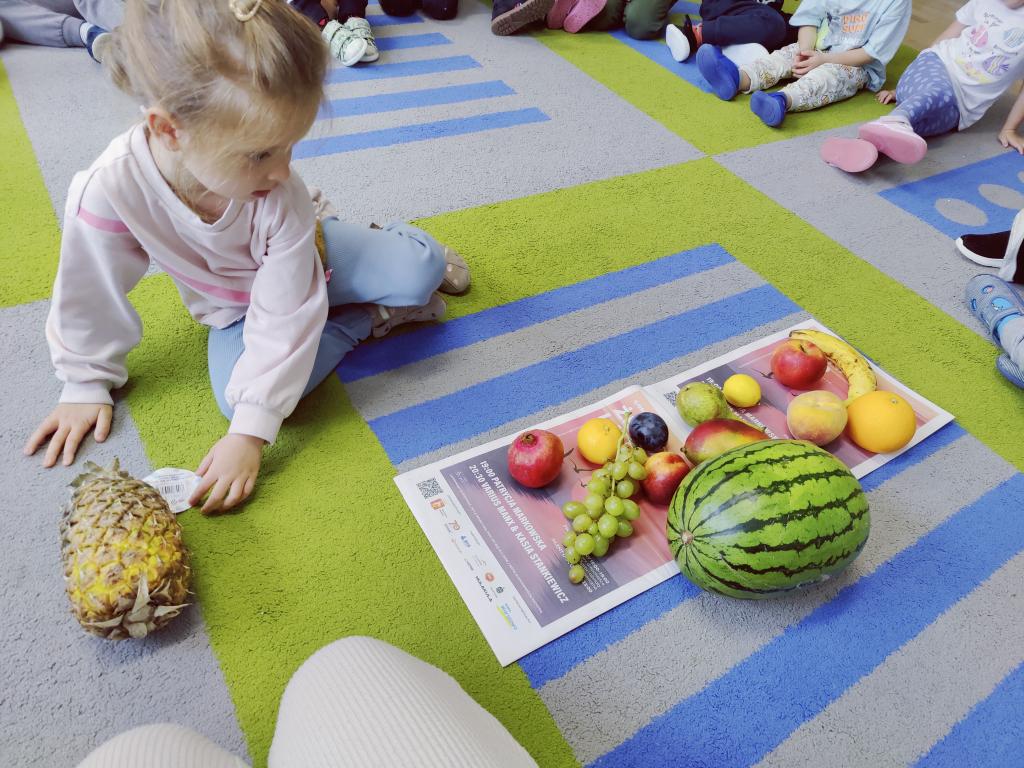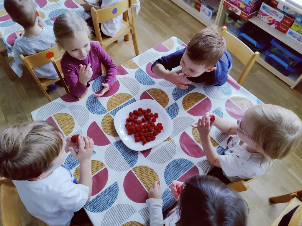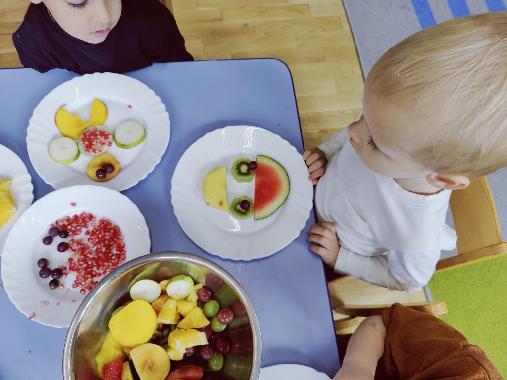 „Co daje nam jedzenie warzyw i owoców i czy w ogóle jest nam potrzebne?”- takie pytania zadawaliśmy sobie w minionym tygodniu, ponieważ tematem naszych zajęć były właśnie warzywa i owoce. Z przyniesionych do przedszkola owoców tworzyliśmy kolorowe obrazki, które chętnie zostały przez nas zjedzone, poznawaliśmy owoce nie tylko smakiem ale i dotykiem, a pod koniec tygodnia wybraliśmy się na zakupy do pobliskiego sklepiku, gdzie jedna grupa kupiła warzywa a druga owoce. Pyszne malinki zniknęły z talerza bardzo szybko, a świadomość, że jedzenie warzyw i owoców dostarcza nam witamin została.