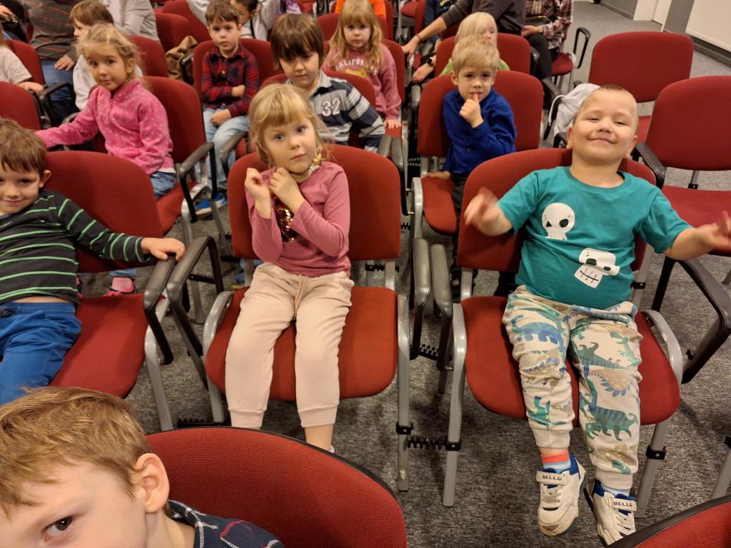 Dnia 28 października dzieci wybrały się do Sali widowiskowej Urzędu Gminy Bielany, aby obejrzeć spektakl pt. „Pimpuś Sadełko” przygotowany na podstawie utworu Marii Konopnickiej. Już sama podróż do teatru była dla przedszkolaków dużym przeżyciem – dzieci z zainteresowaniem obserwowały otoczenie, rozmawiały o tym, jak należy zachowywać się w teatrze i z niecierpliwością oczekiwały rozpoczęcia przedstawienia. Spektakl opowiadał o przygodach wesołego i nieco niesfornego kotka Pimpusia, który uczęszczał do szkoły i uczył się odpowiedzialności oraz dobrych manier. Przedstawienie łączyło elementy gry aktorskiej, muzyki i tańca, dzięki czemu dzieci mogły aktywnie uczestniczyć w spektaklu, śmiać się i przeżywać losy bohatera. Po zakończeniu przedstawienia dzieci nagrodziły aktorów gromkimi brawami.