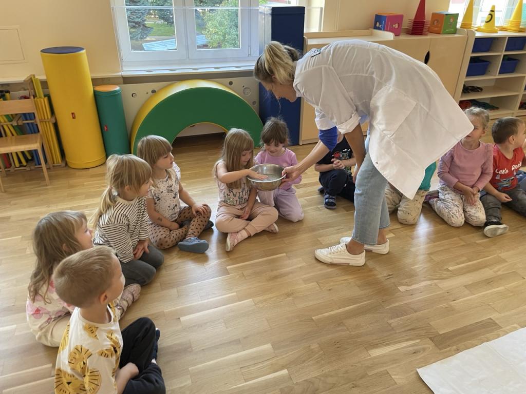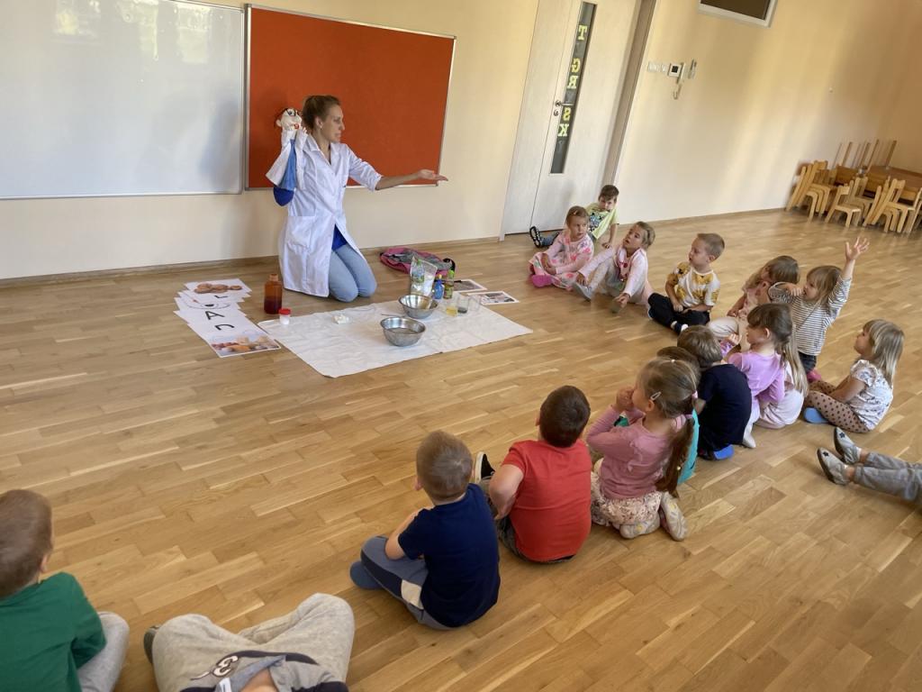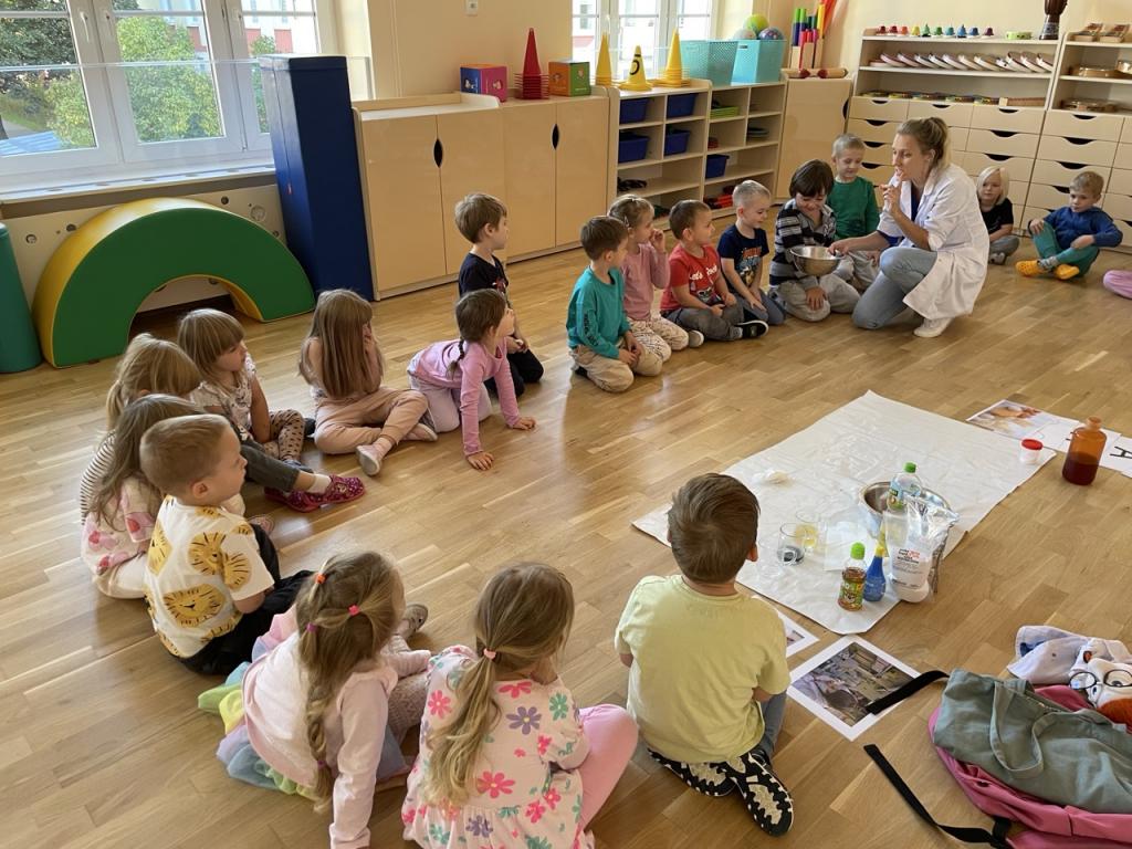 Dzieci witają się z profesorkiem LabolkiemProwadząca prezentuje ilustracje, dzieci słuchająProwadząca rozpoczyna eksperymentyDziewczynka pomaga podczas eksperymentuDzieci zapoznają się z zapachem  Dzieci sprawdzają wydobywające się bąbelki podczas eksperymentuDzieci słuchają dźwięku rozpuszczającej się kuli kąpielowejDzieci obserwują eksperyment, prowadzącą pokazuje dzieciom miskę z bliskaDzieci zgłaszają się do odpowiedzi na zadane pytanie przez prowadzącą